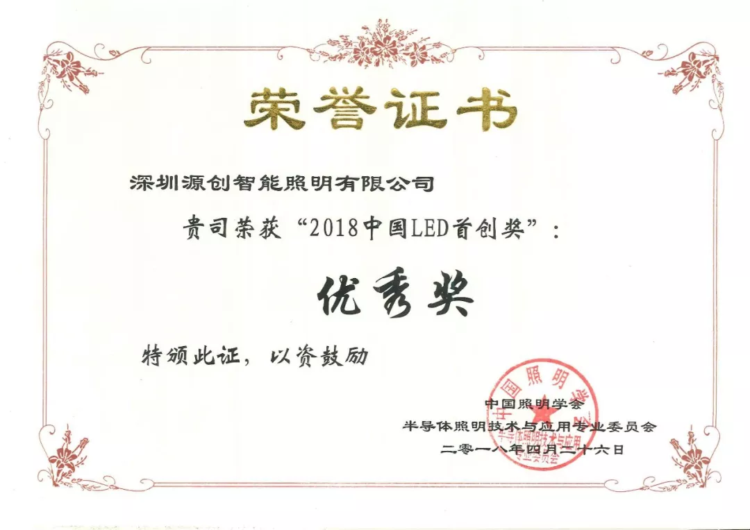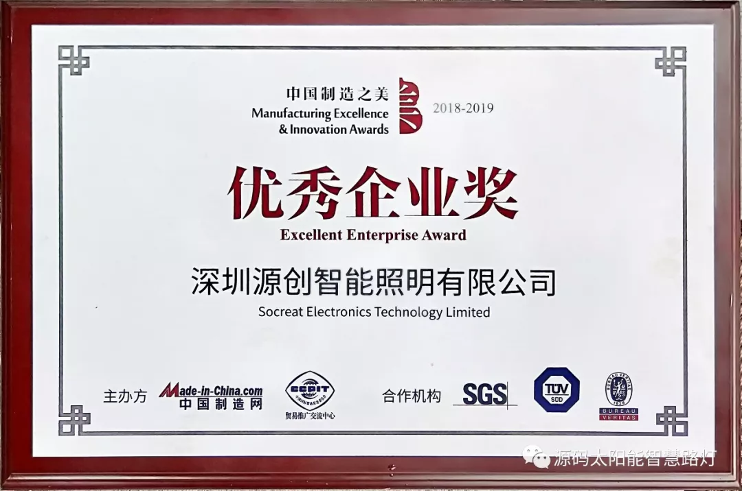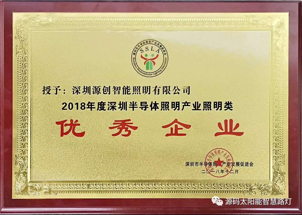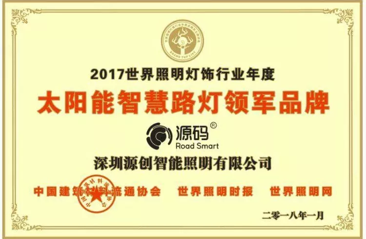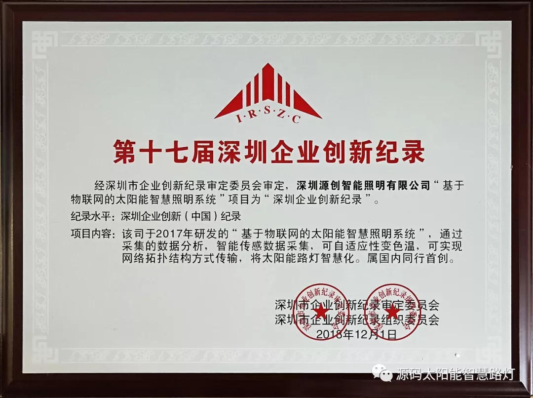 2019年1月9日,第十七屆深圳企業(yè)創(chuàng)新紀(jì)錄成果發(fā)布會(huì)暨深圳工業(yè)總會(huì)、深圳市先進(jìn)制造業(yè)聯(lián)合會(huì)、深圳市企業(yè)品牌建設(shè)促進(jìn)會(huì)2018年度會(huì)員大會(huì)在深圳舉行。深圳源創(chuàng)智能照明有限公司,憑借在太陽(yáng)能路燈創(chuàng)新技術(shù)的突出優(yōu)勢(shì)獲得“深圳企業(yè)創(chuàng)新(中國(guó))紀(jì)錄”獎(jiǎng)。