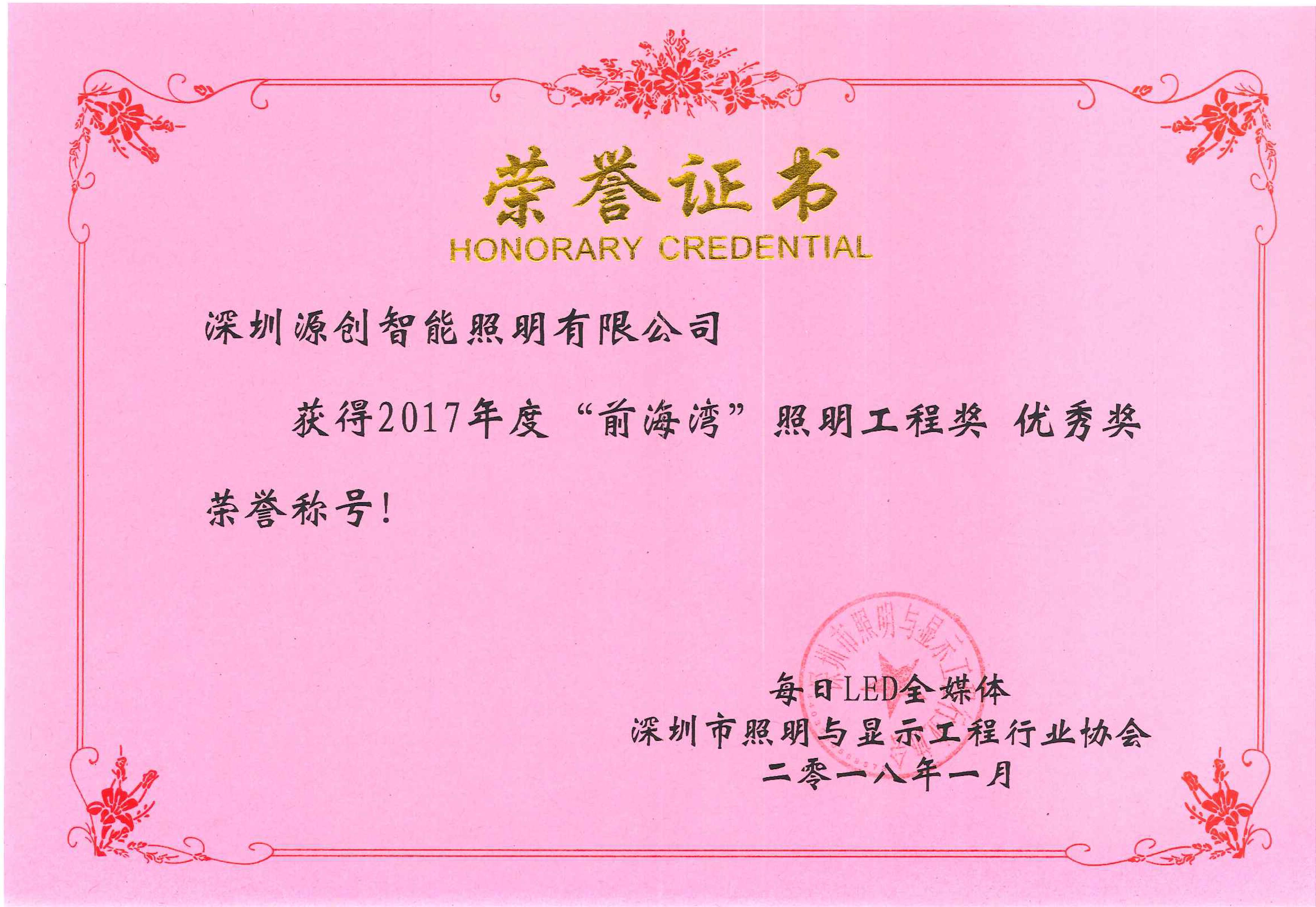 2018年1月,由每日LED全媒體及深圳市照明與顯示工程行業(yè)協(xié)會(huì)主辦的年度盛宴在深圳舉行,源碼榮獲2017年度“前海灣”照明工程獎(jiǎng)優(yōu)秀獎(jiǎng)。