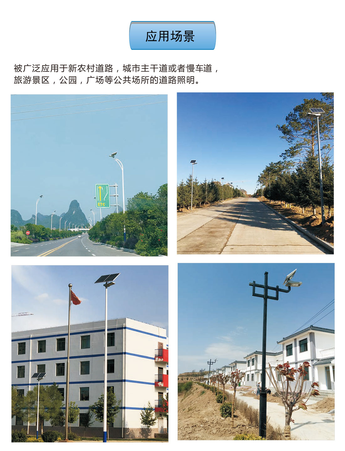 夜鷹燈作為高性價比中高功率一體化太陽能路燈,被廣泛應用于新農村道路、鄉鎮道路、城市主干道或者慢車道、旅游景區、廣場、工業園區等場景。